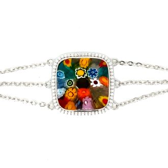 Murano Millefiori Multi Colored Cushion Cut Glass, CZ Halo Bracelet