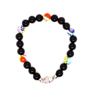 Murano Millefiori Multi Colored Glass And Onyx Bead Bracelet.