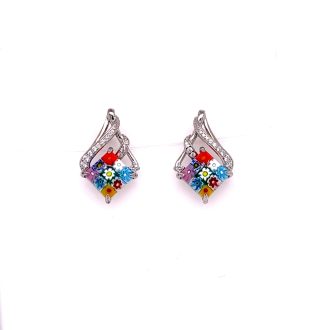Murano Millefiori Cushion Cut Glass French Back CZ Accent Earrings.