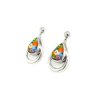 Murano Millefiori Pear Cut Glass And Cubic Zirconia Vintage Inspired Earrings.