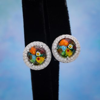 Murano Millefiori Round Cut Glass And Cubic Zirconia Vintage Inspired Earrings.