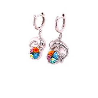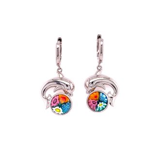 Murano Millefiori Round Glass & Dolphin Charm Huggie Earrings..