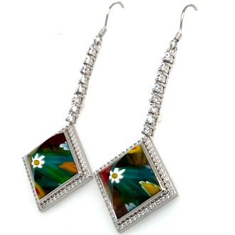 Murano Millefiori Princess Cut Glass & CZ Dangling Earrings.