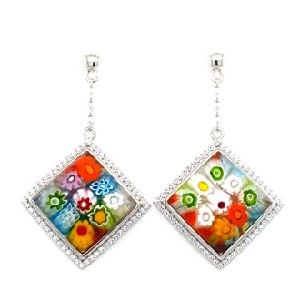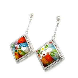 Murano Millefiori Princess Cut Glass And CZ Drop Earrings.