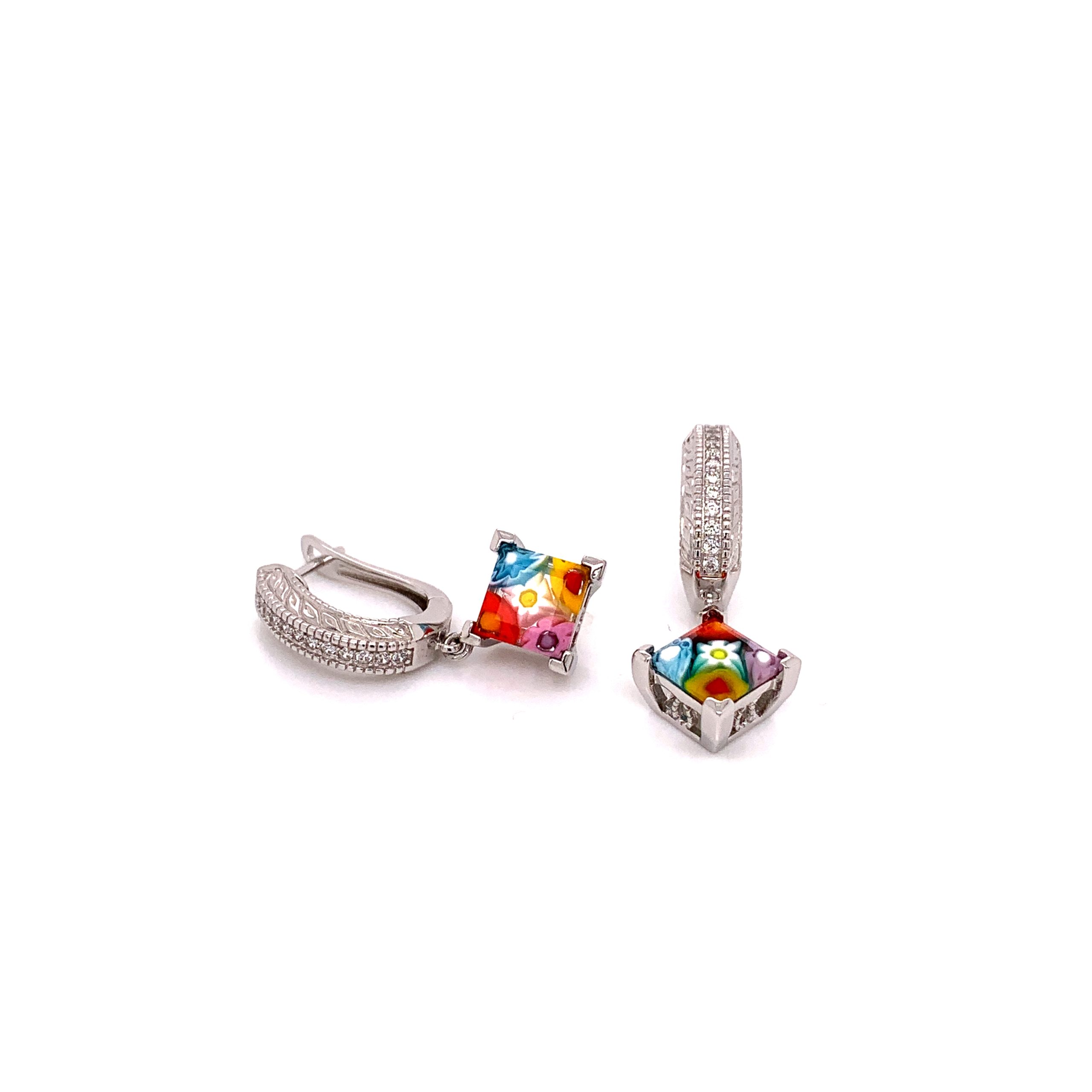 Hand Crafted, Sterling Silver 925, Huggie Mounts. Prong Set, Cushion Cut, Murano Millefiori, Multi Colored Glass Drops. French Back, Hand Etched, Huggie Hoops, Micro Pave Set Cubic Zirconia Accents.