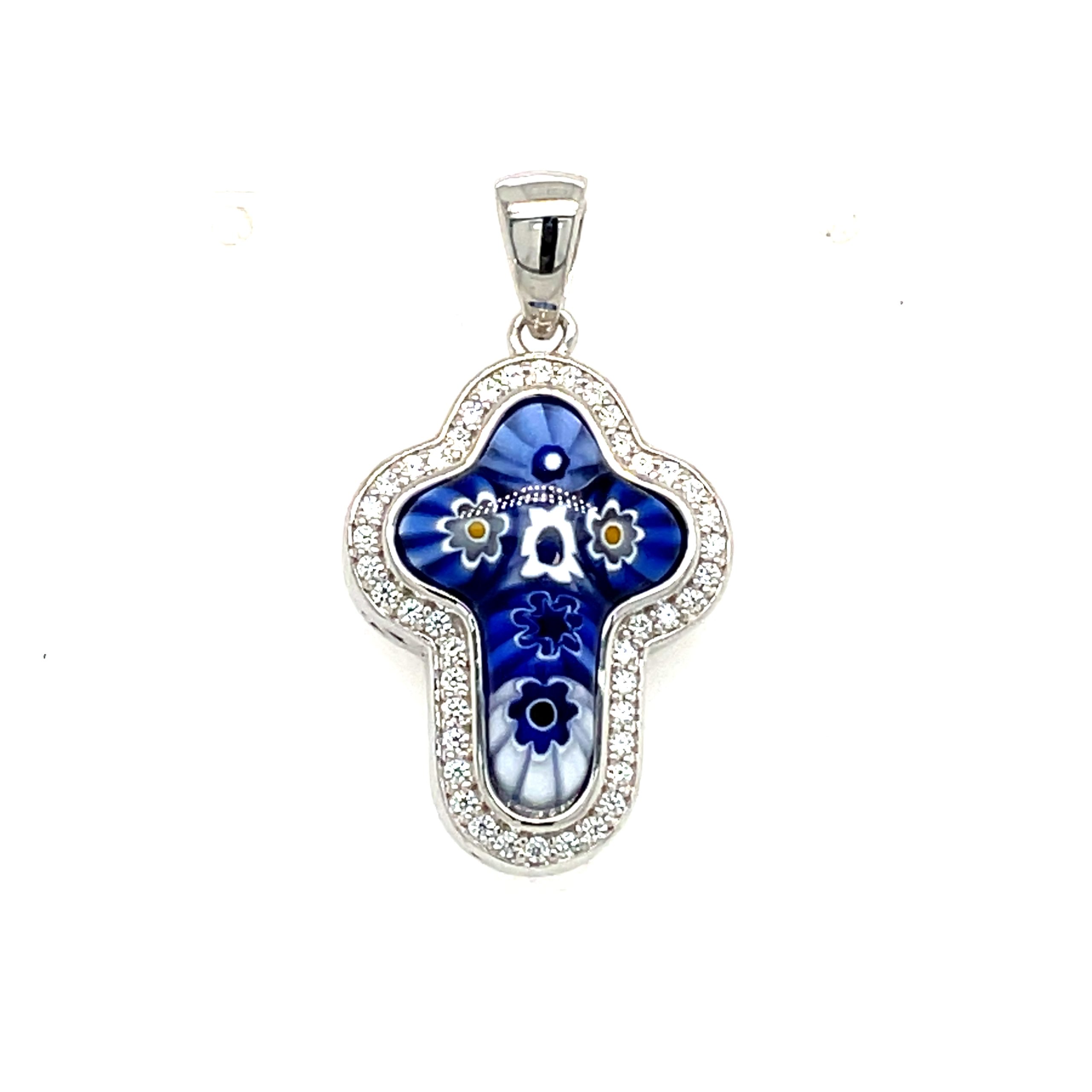 PendantsMillefiori Blue Cubic Zirconia Halo Blue Cross / CZ Halo Cross Millefiori Murano Glass Pendant