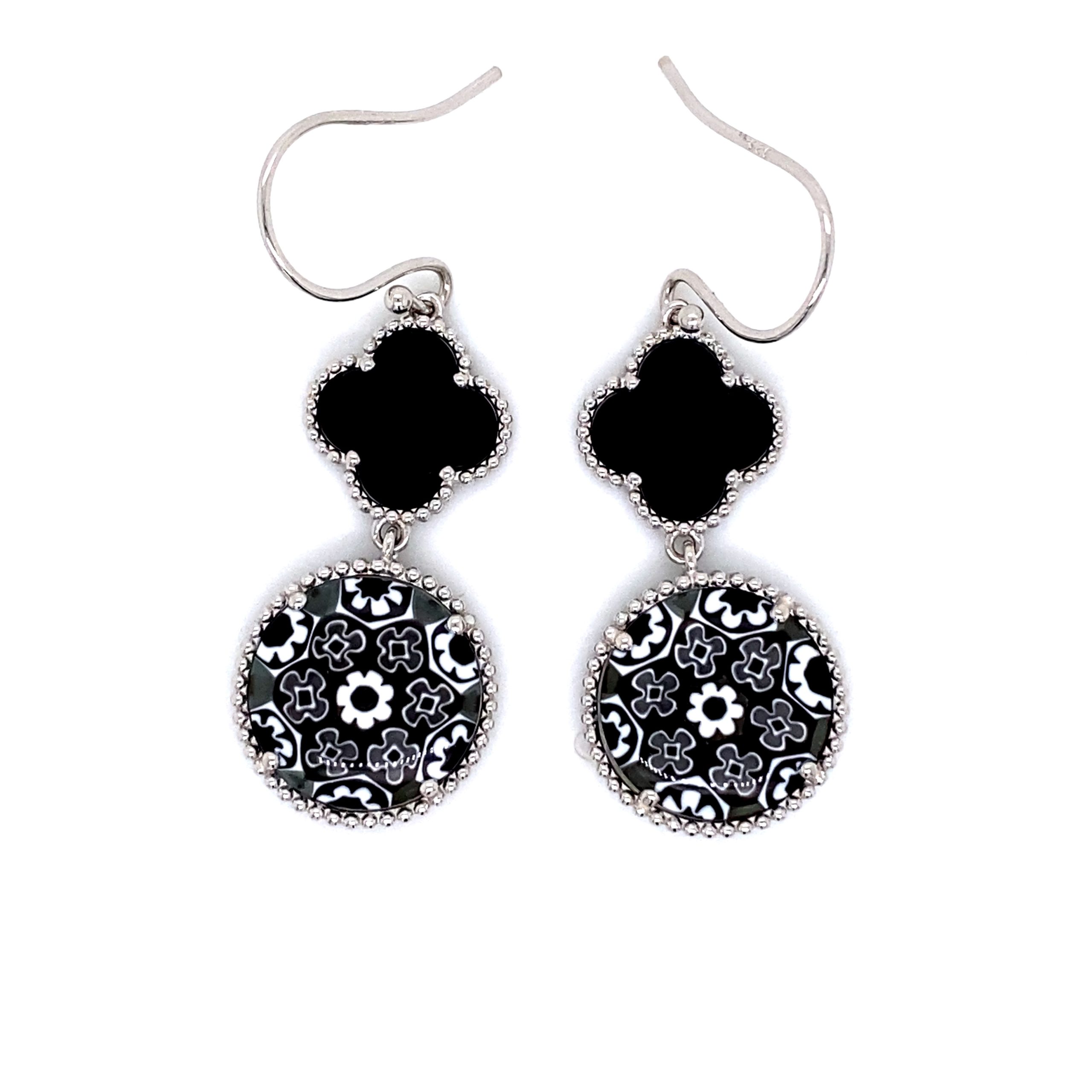 Hand Crafted Sterling Silver 925,Miligrain Mounts. French Wire Hinged, Double Drop Bezel Set Earrings. Black Onyx Quatrefoil And Round, Murano Millefiori Glass. Milgrain Beading Accents.