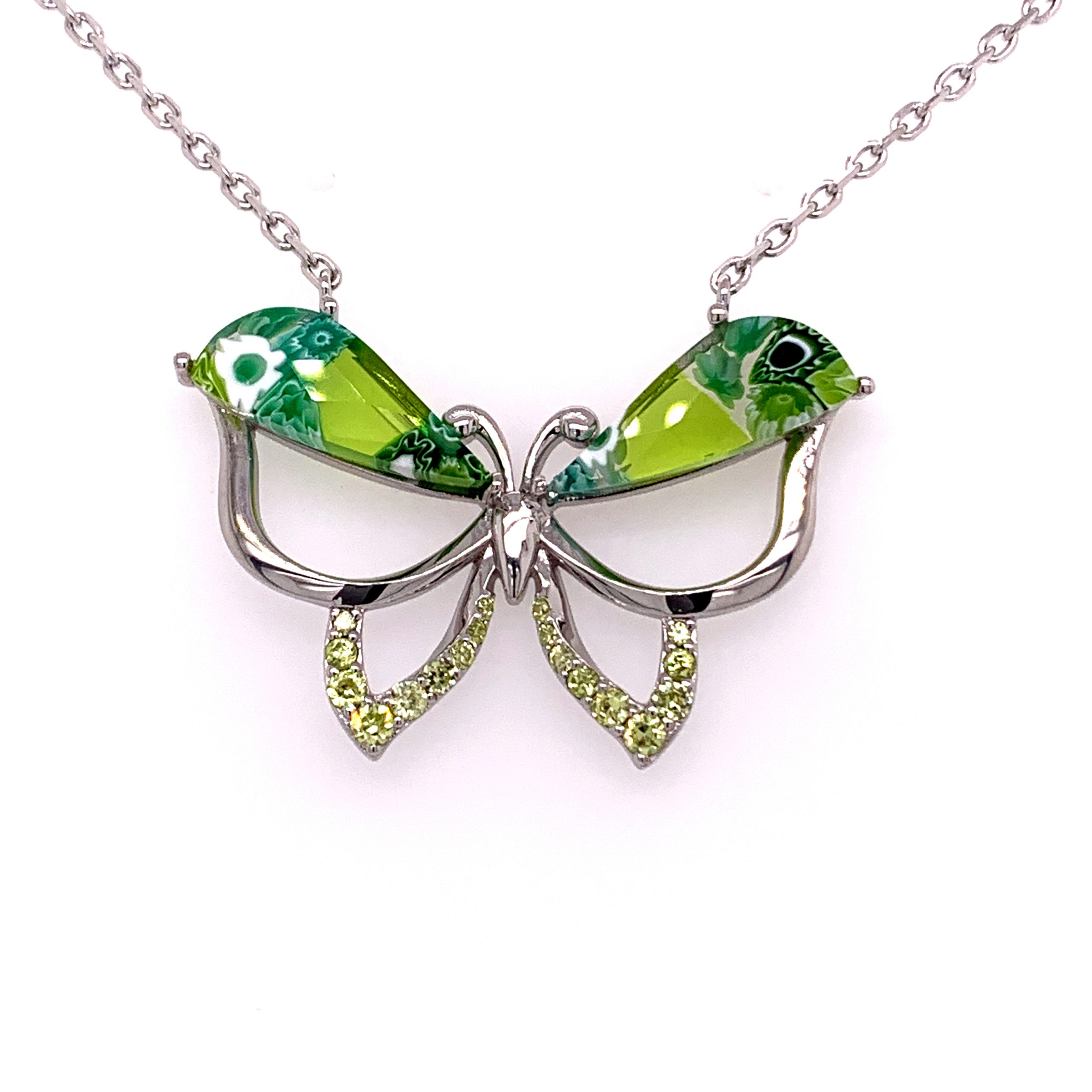 Millefiori Green Murano Glass Butterfly Necklace Green Cubic Zirconia Accents