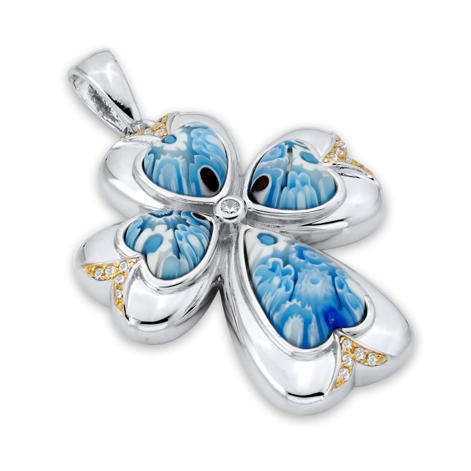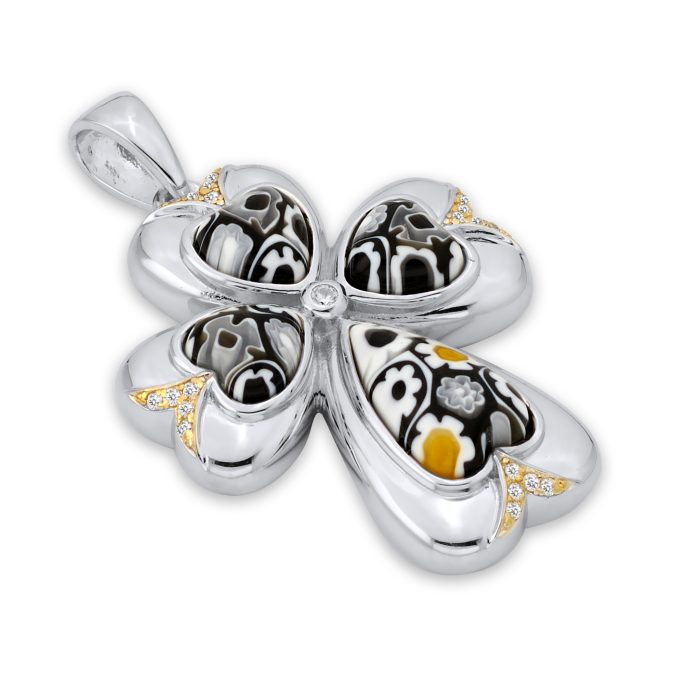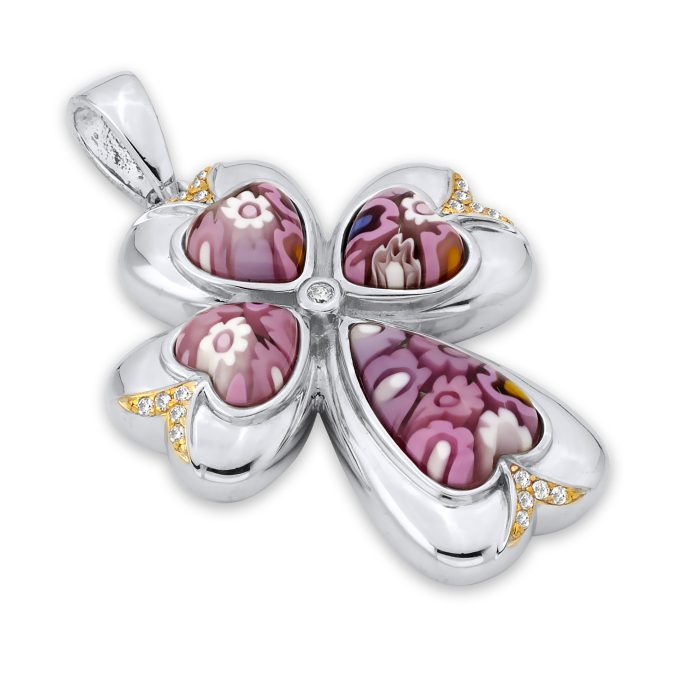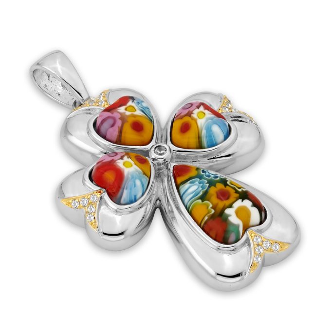 Sterling Silver 925 Accent Gold Plating. Four Millefiori Multi Colored Heart Shaped Murano Glass. Micro Pave Set Cubic Zirconia on Gold Accents.
