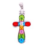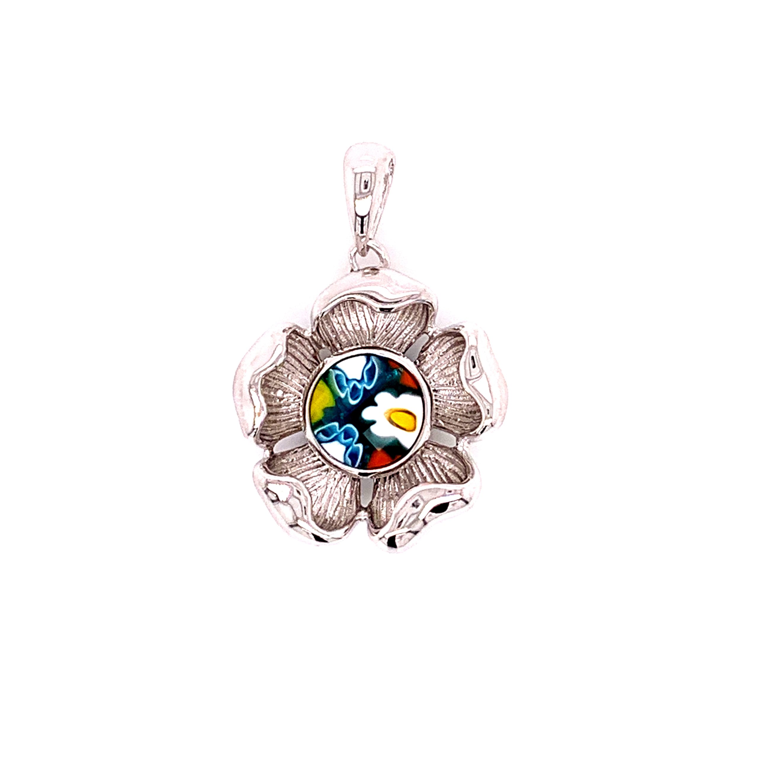 Hand Crafted Sterling Silver 925, Lotus Motif Mount. Bezel Set, Round Multi Colored Millefiori Murano Glass.