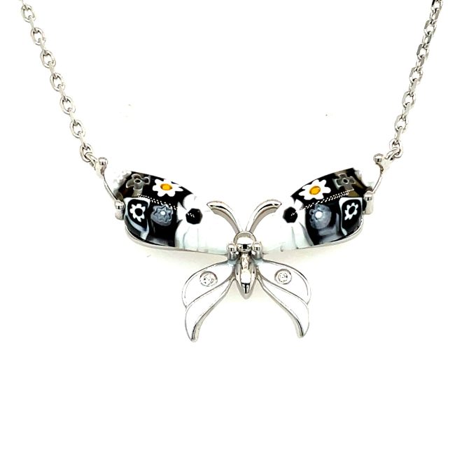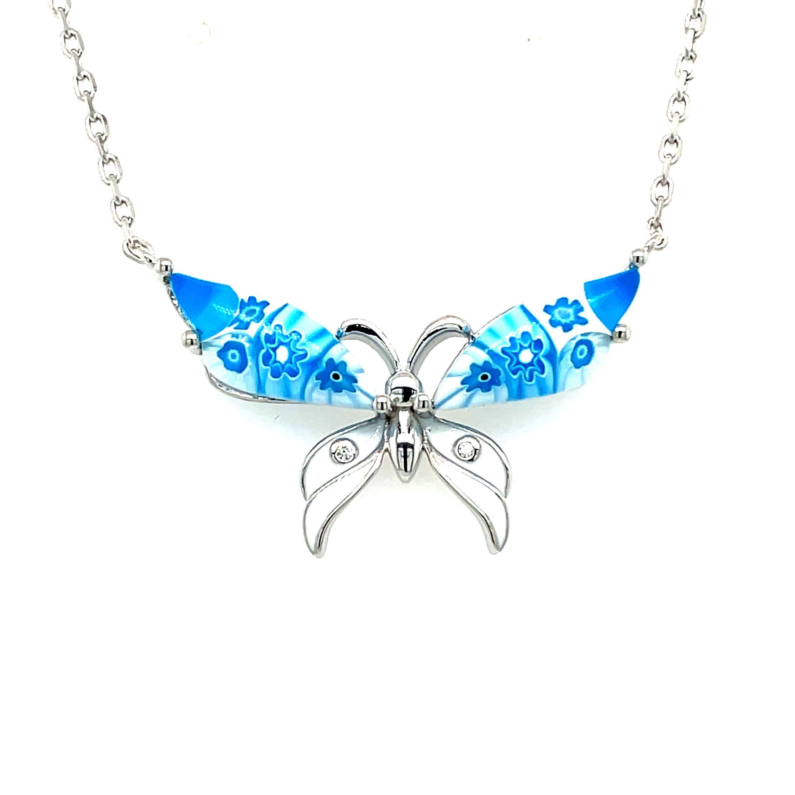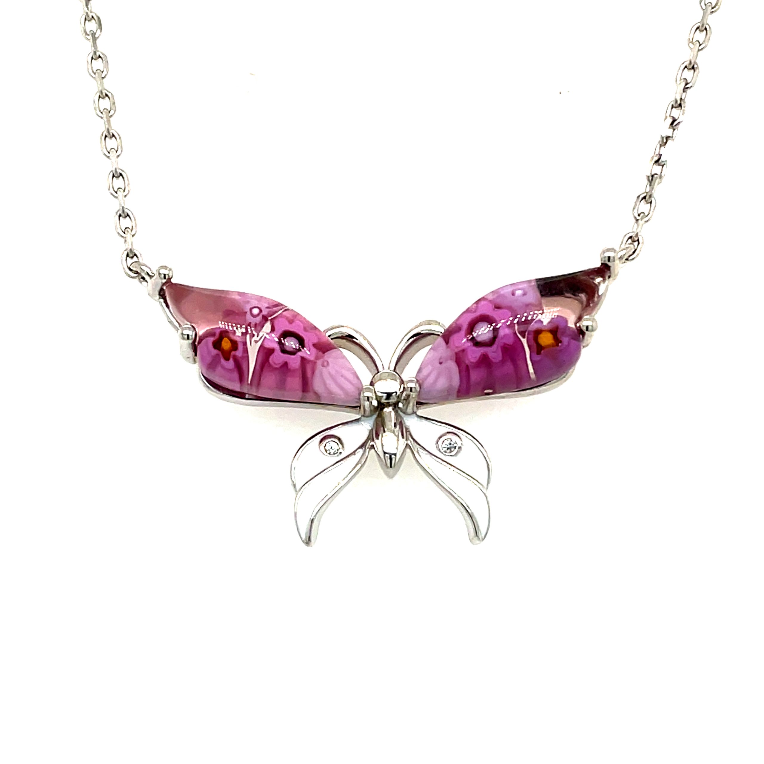 Millefiori Multi Color Murano Glass Butterfly Necklace with Enamel And CZ Accent
