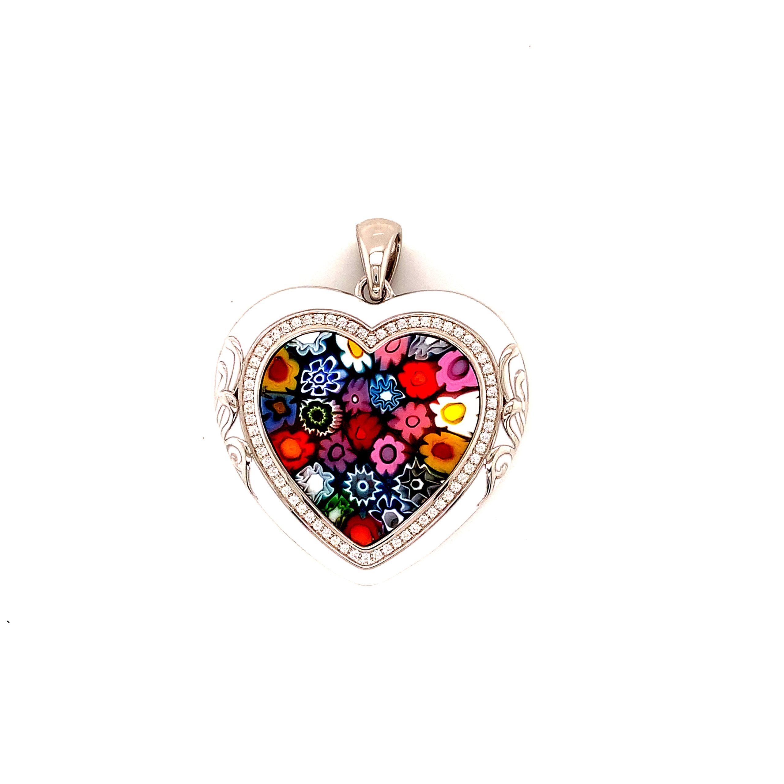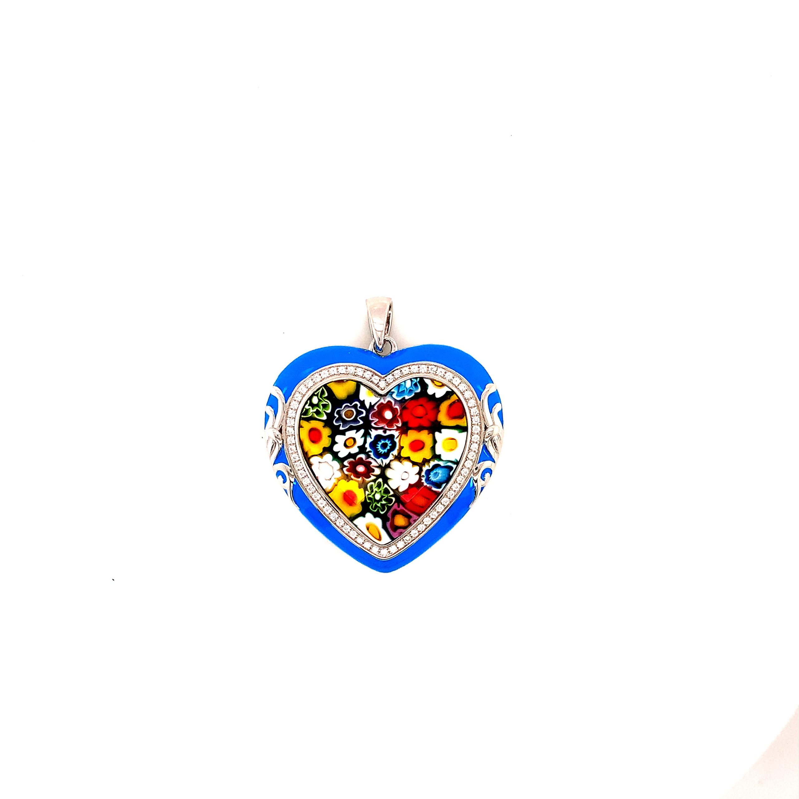 Hand-Crafted 925 Sterling Silver Heart Pendant Mount. White And Blue Enameling Accents. Multi Colored Millefiori Murano Glass Heart. Cubic Zirconia Micro Pave Set Halo.