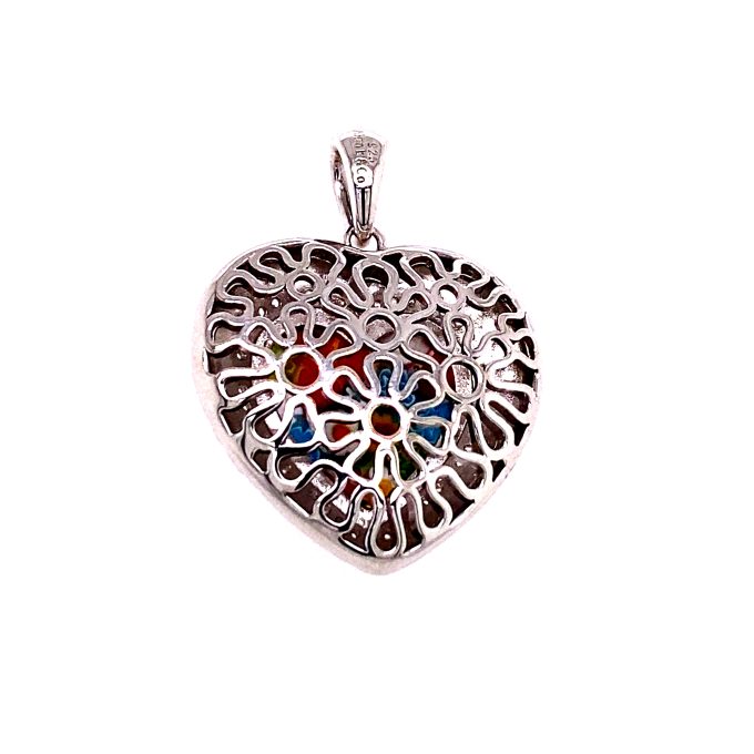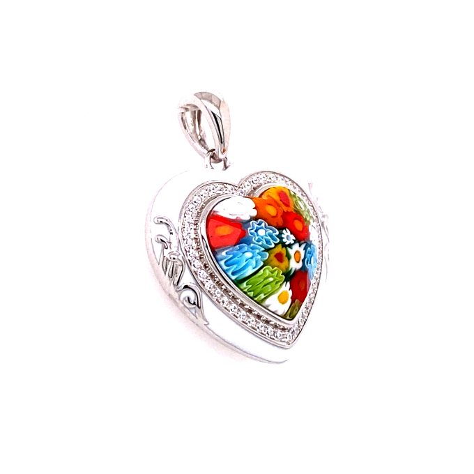 Hand-Crafted 925 Sterling Silver Heart Pendant Mount. White Enameling Accents. Multi Colored Millefiori Murano Glass Heart. Cubic Zirconia Micro Pave Set Halo.