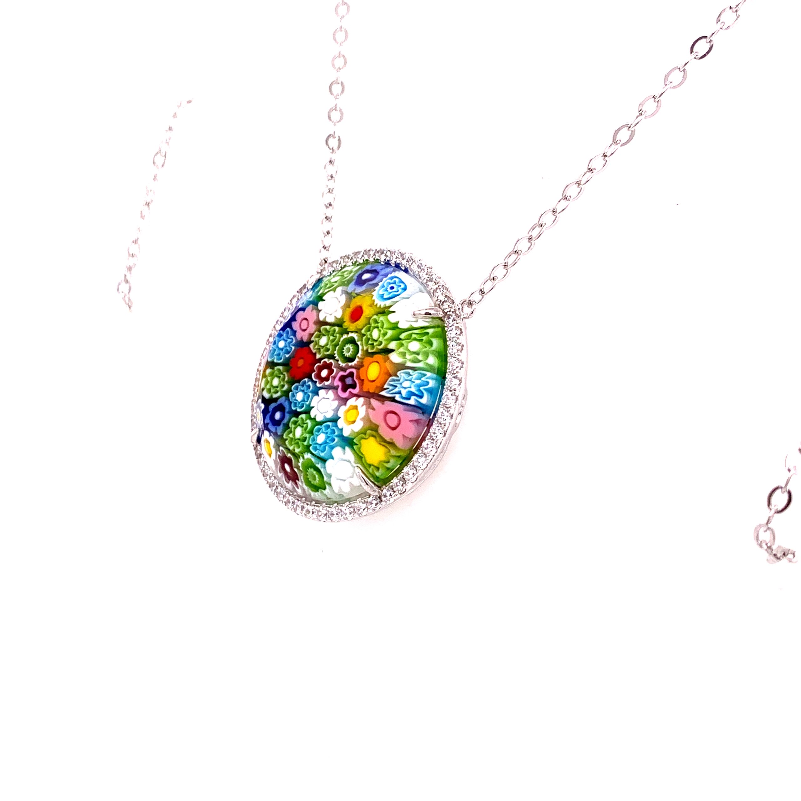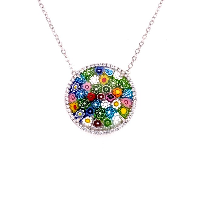 Millefiori Cubic Zirconia Halo 14.00 GramsSilver Round Necklace
