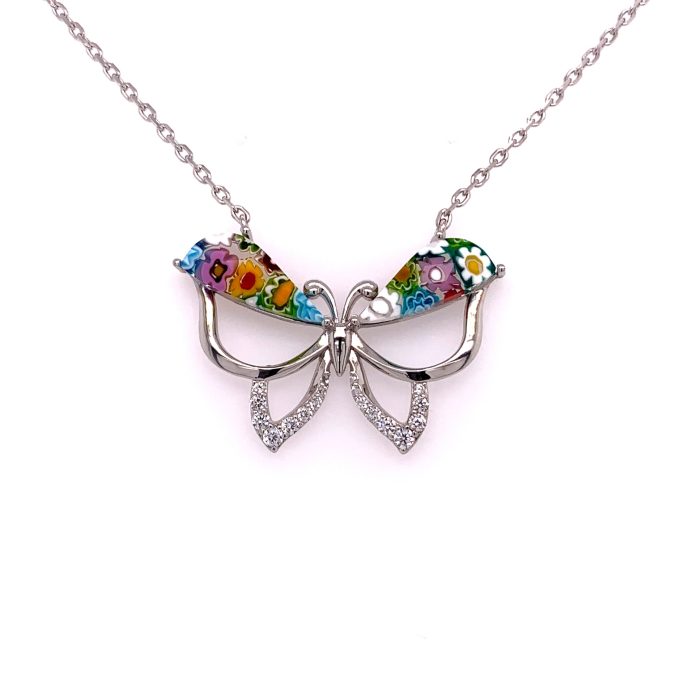 NecklacesMillefiori Multicolor Micro Pave CZ Accents 0.00 GramsSilver Multi Colored Butterfly Butterfly Necklace