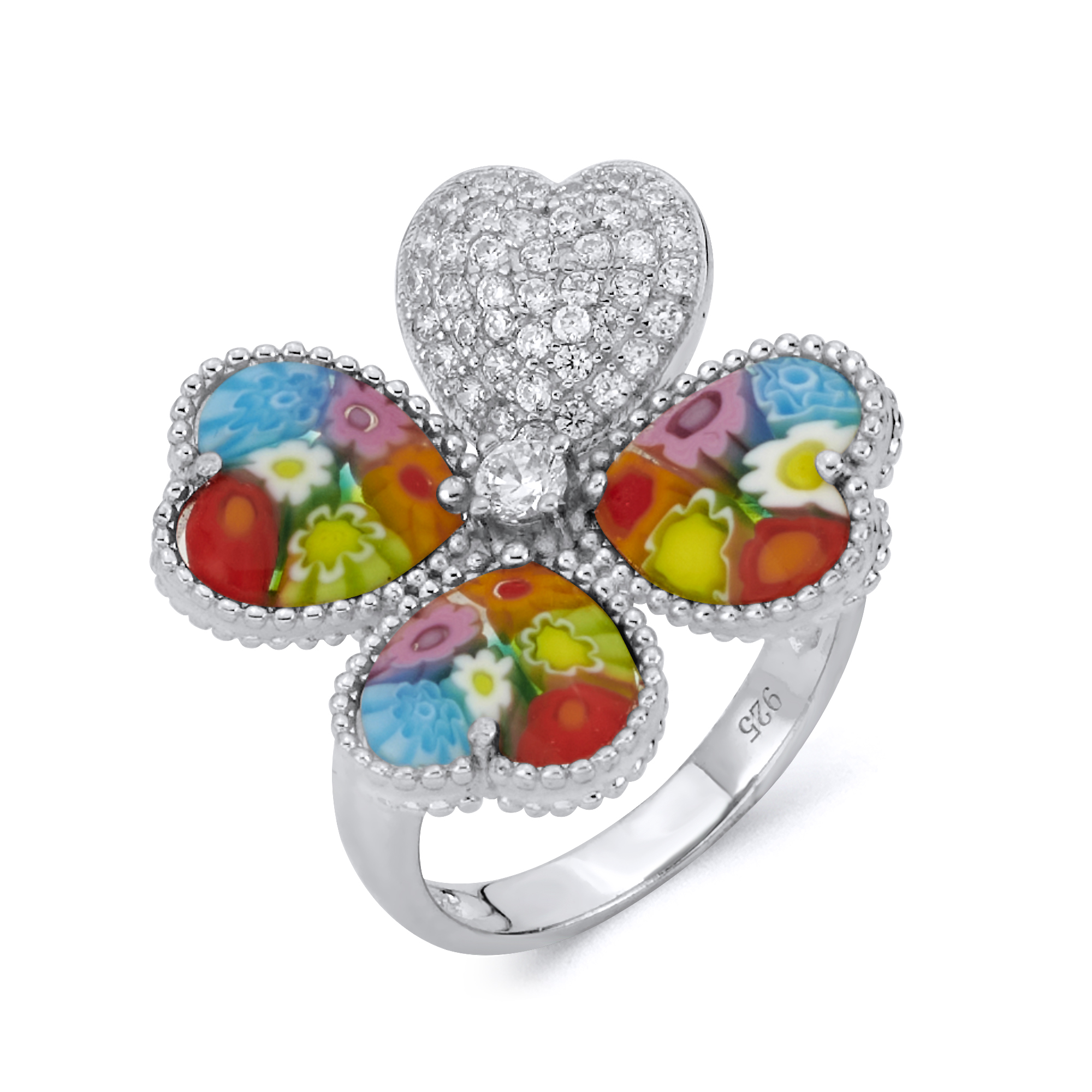 Hand Crafted, Sterling Silver 925 Mount. Three Bezel Set, Multi Colored, Heart Shaped, Millefiori Murano Glass Petals. Micro Pave Set Cubic Zirconia. Milgrain Beading Accents.