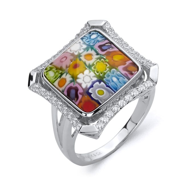 Millefiori Multicolor Cubic Zirconia Accents Cocktail Ring, Square Square Murano Glass Ring