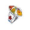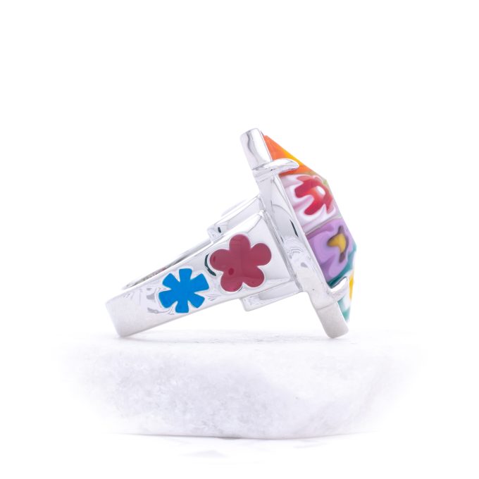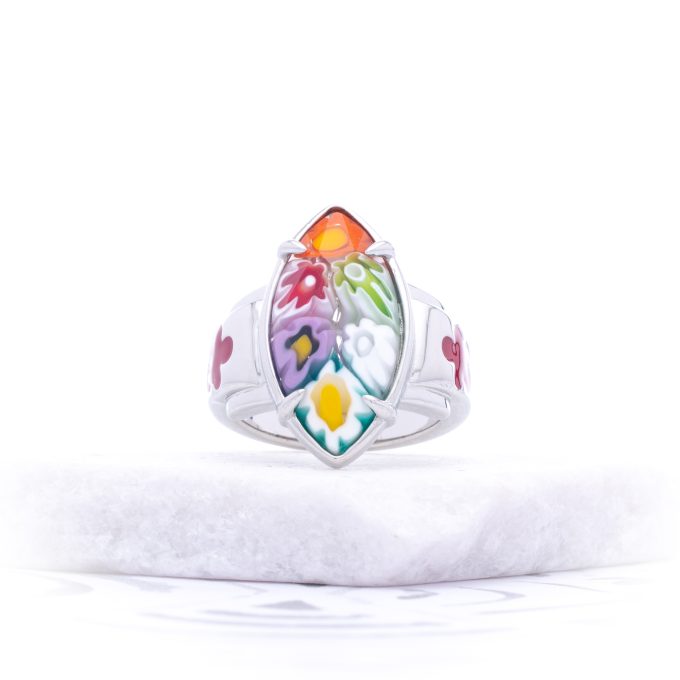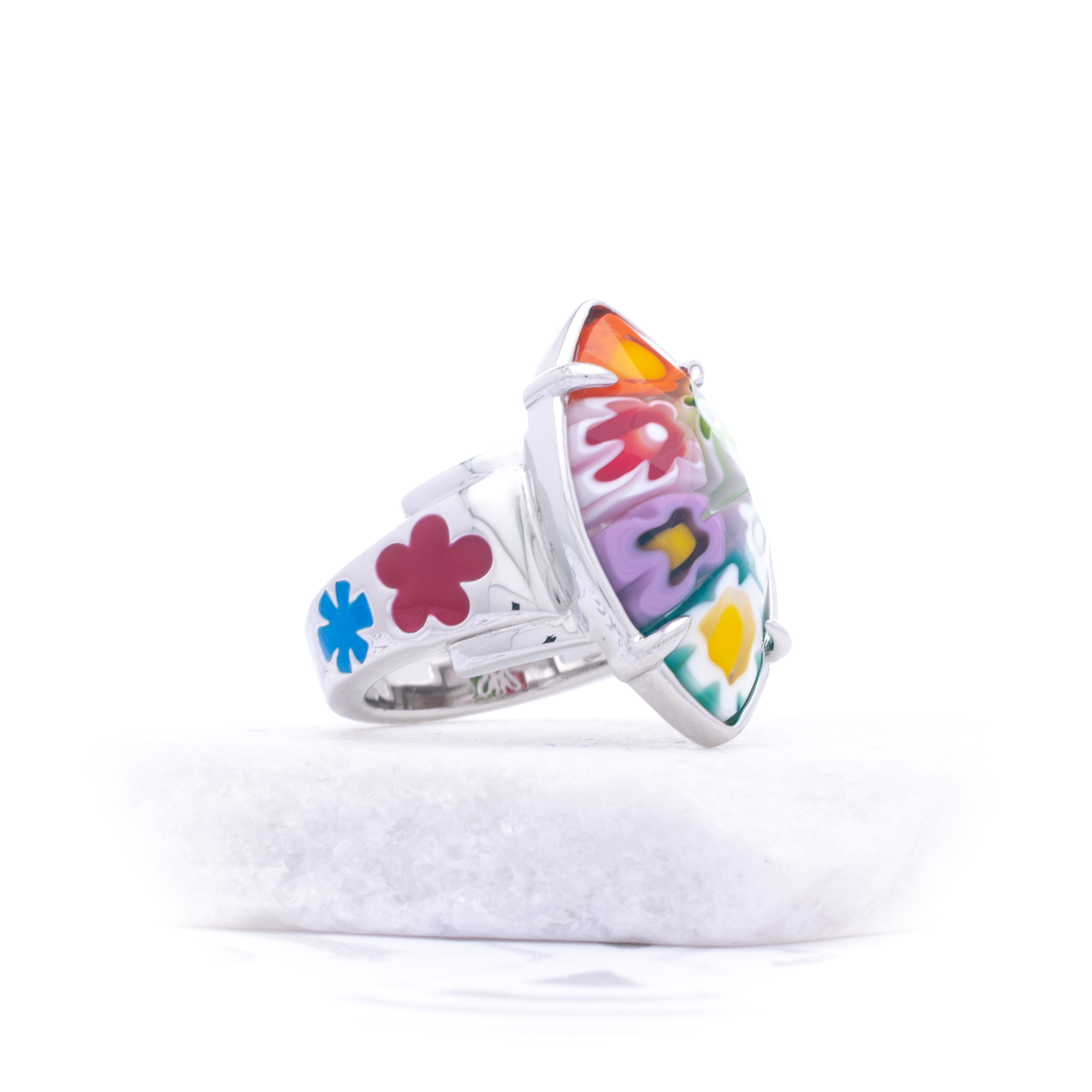 Hand Crafted, Sterling Silver, 925 Mount. Prong Set, Marquise Cut, Multi Colored, Millefiori Murano Glass. Enamel Accents on Shank.