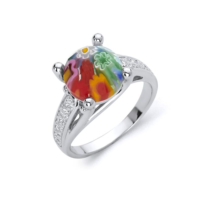 Millefiori Multicolor Cubic Zirconia Accents Millefiori Solitaire Round Millefiori Murano Glass Ring