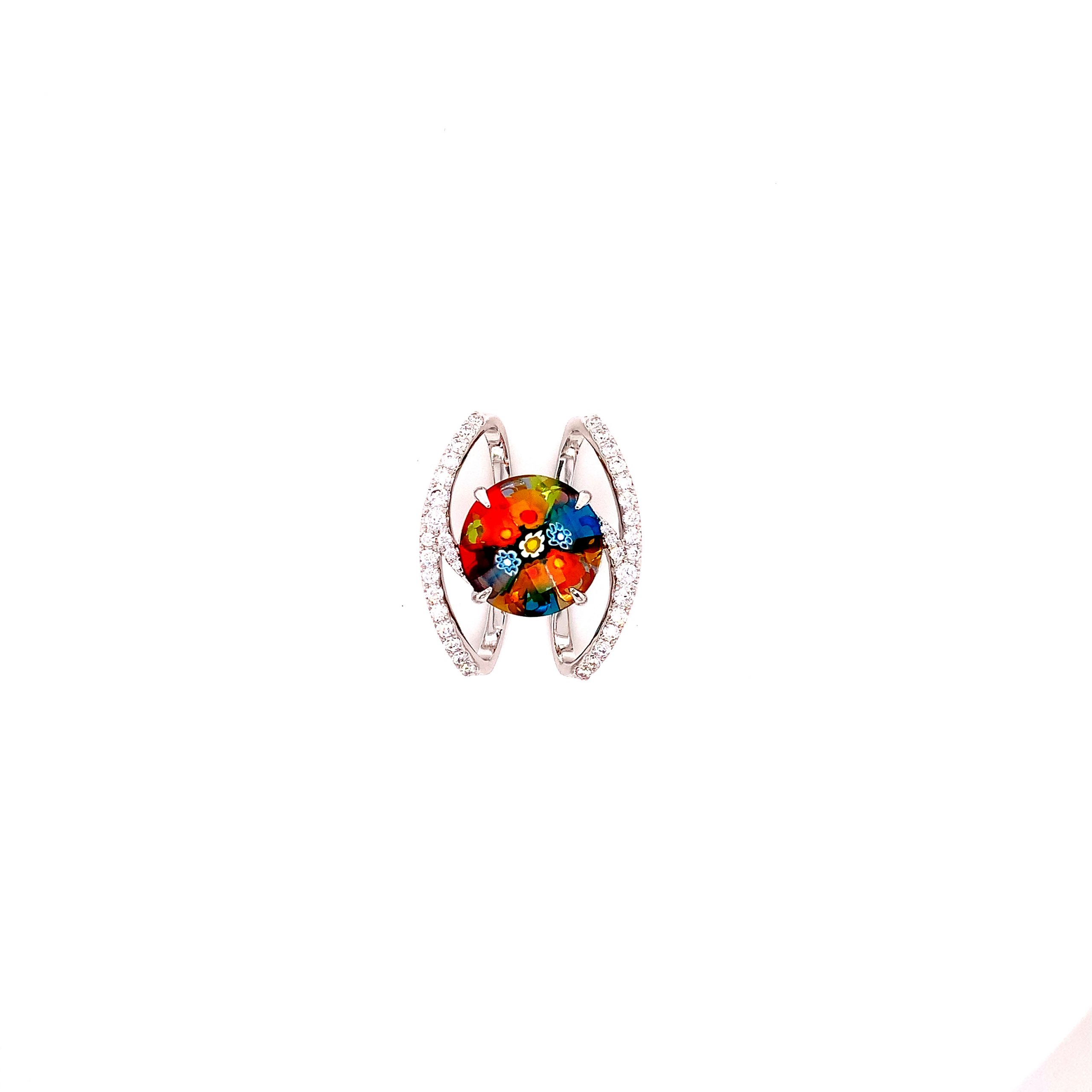 Hand Crafted Sterling Silver 925 Mount. Prong Set, Faceted, Round, Murano, Millefiori Multicolored Glass . Flanked By Micro Pave Set, Cubic Zirconia Accents.