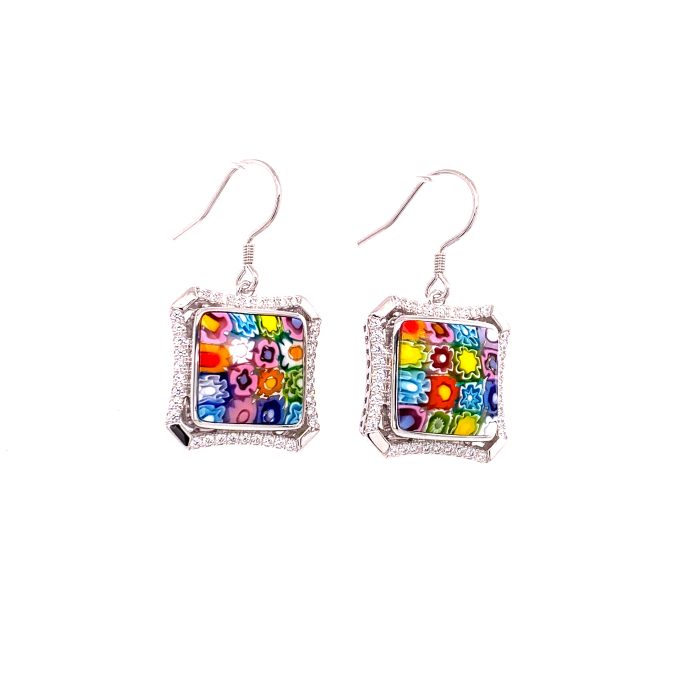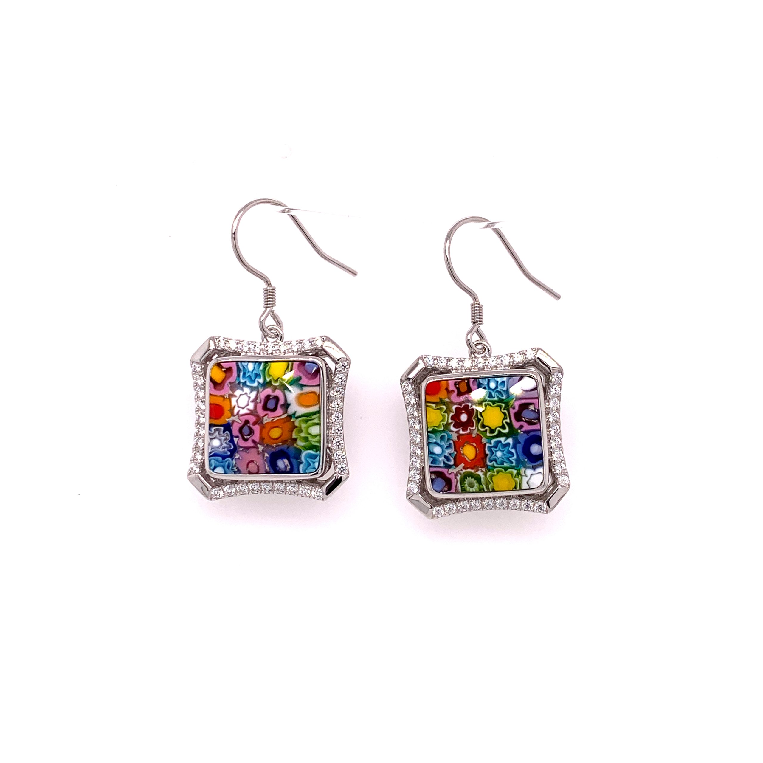 Murano Millefiori Cushion Cut Glass, Semi Halo Cubic Zirconia Drop Earrings.