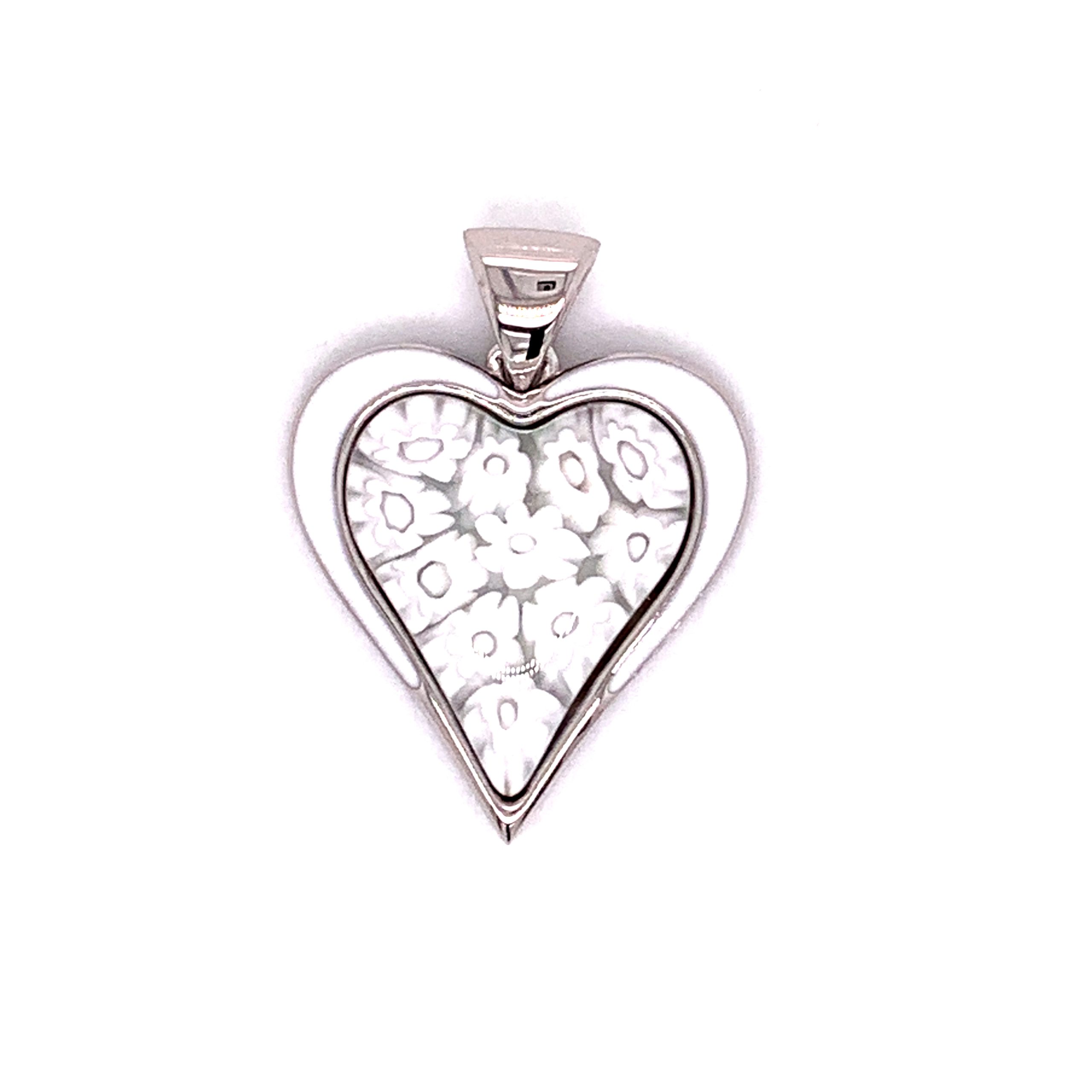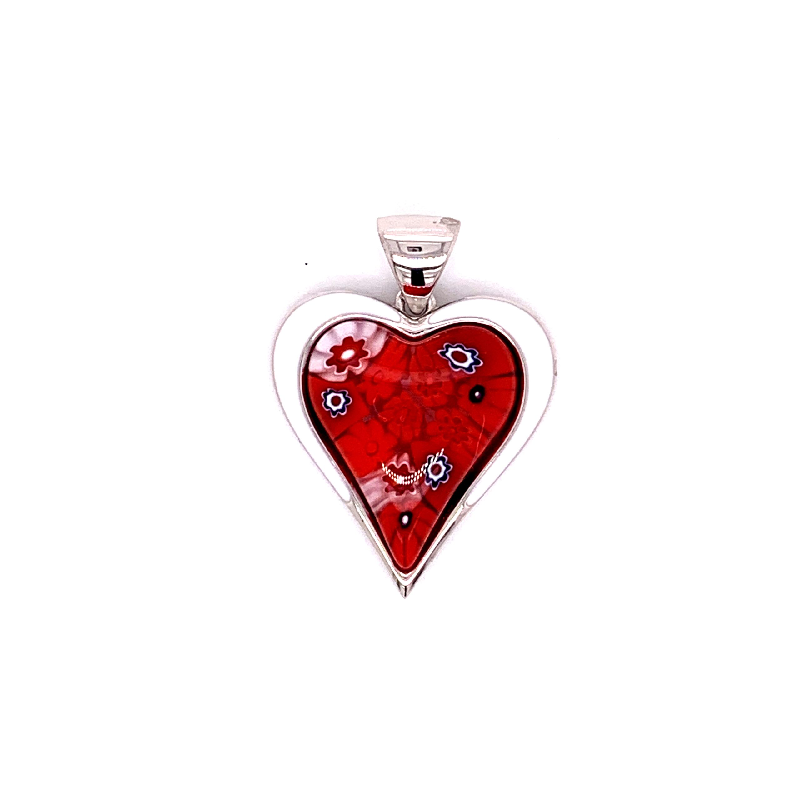 Hand Crafted, Sterling Silver 925 Mount. Bezel Set, Murano, Millefiori, Heart Shaped Glass. Available in Multi Colored, Red And White Glass. White Enamel Accents.