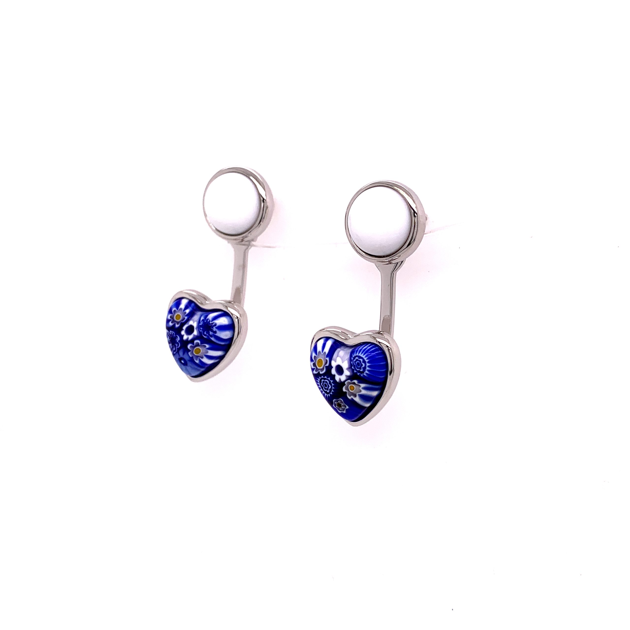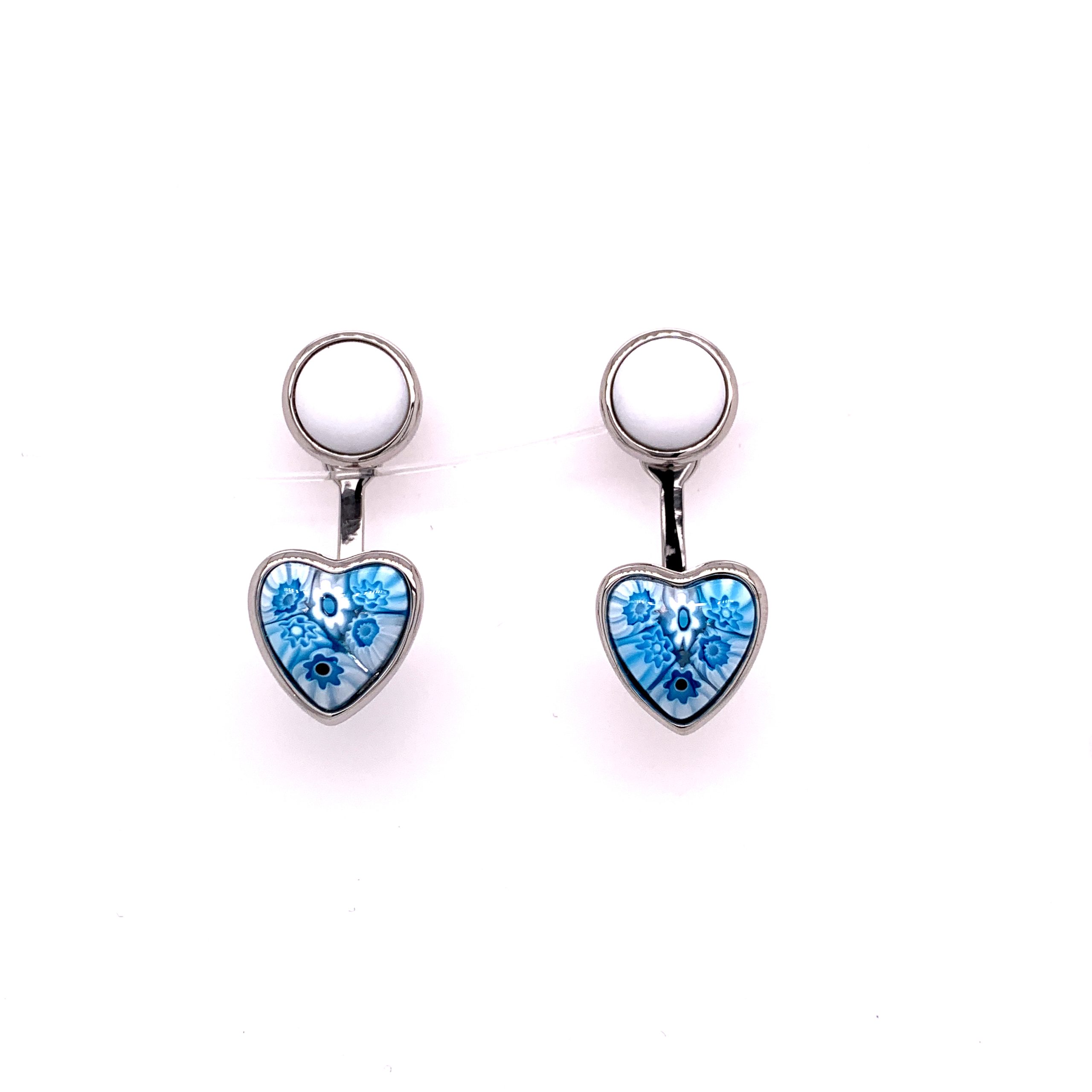 Hand Crafted, Sterling Silver 925 Mounts. Push Back Hinge. Bezel Set, Heart Shaped Murano Millefiori Multi Glass Drop. White onyx Button Stud.