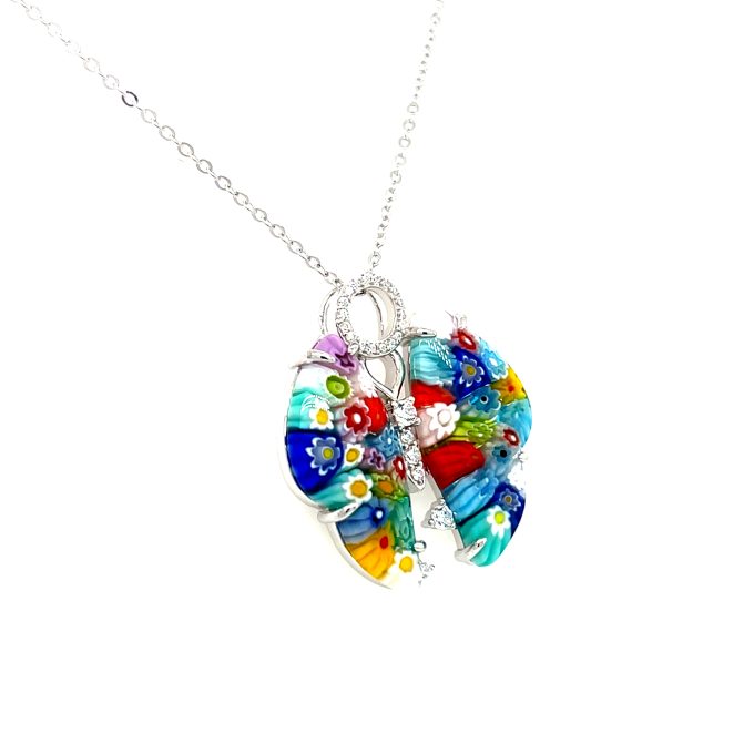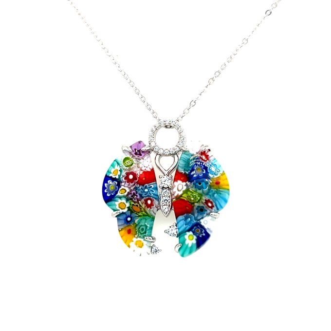 Hand Crafted, Sterling Silver, 925 Mount. Prong Set, Murano Millefiori, Multi Colored Glass Into Butterfly Motif Pendant. CZ Accents & CZ Bale 18 inch .925 Sterling Silver Chain including 2 inch extender