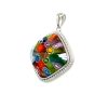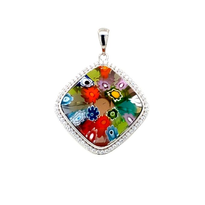 Murano Millefiori Multi Colored Cushion Cut Glass, CZ Halo Pendant.