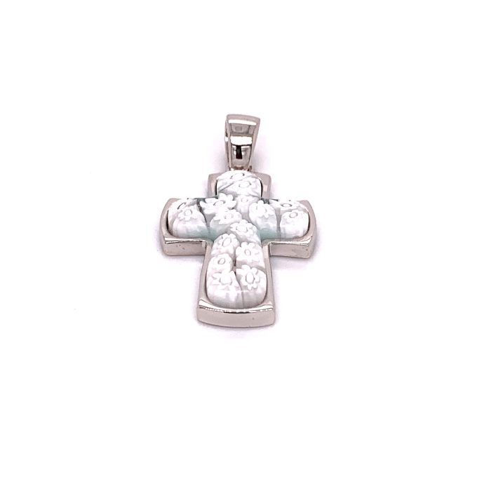 Hand Crafted, Sterling Silver, 925 Mount. Bezel Set, Cross Shaped, Millefiori, Multi Colored and White Murano Glass.