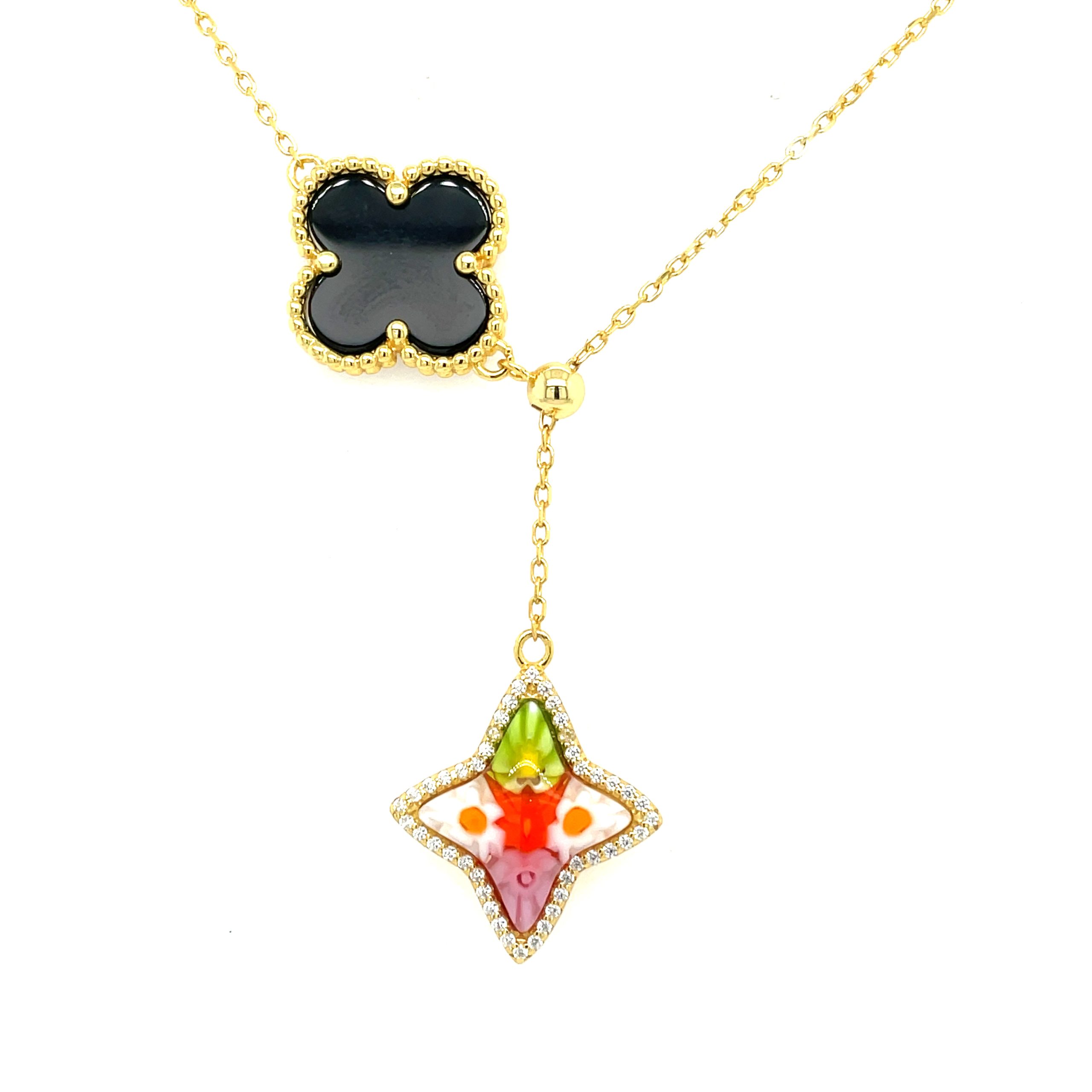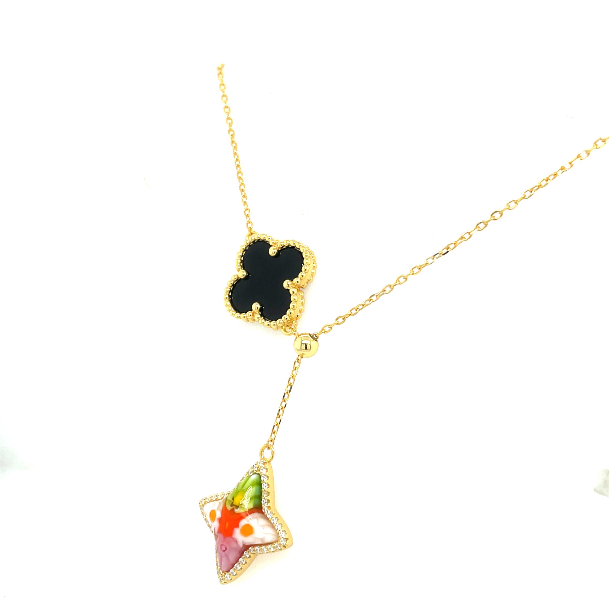 Murano Millefiori Multi Colored Glass North Star and Onyx Quatrefoil Gold Plated Necklace