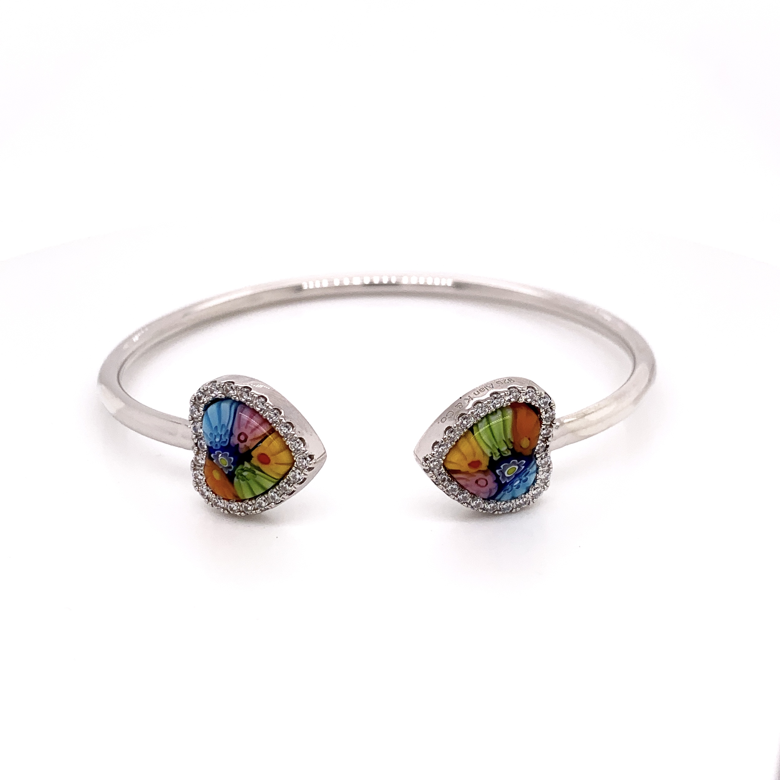 Murano Millefiori Multi Colored Heart Glass And Cubic Zirconia Cuff Bracelet.