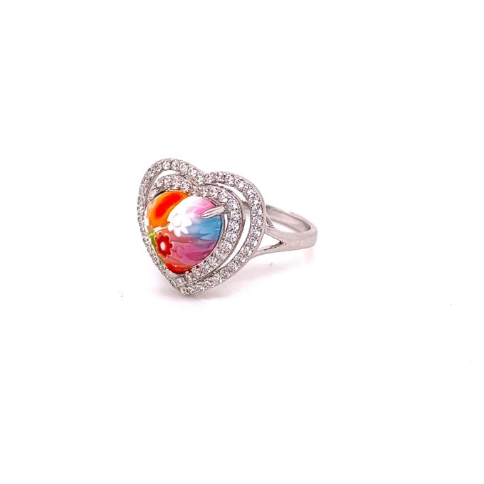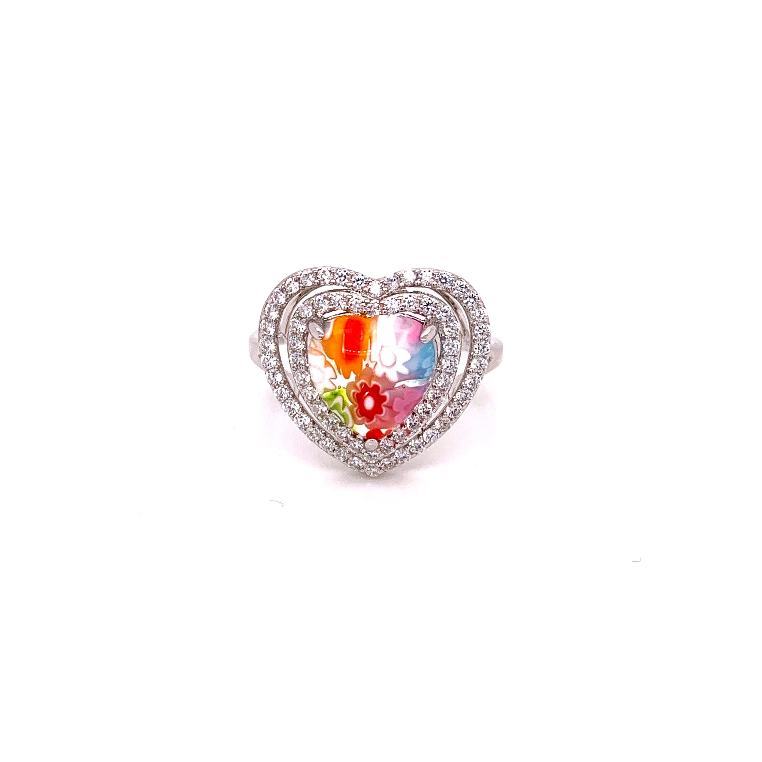 Murano Millefiori Multi Colored Heart Shaped Glass With CZ Halo Ring.