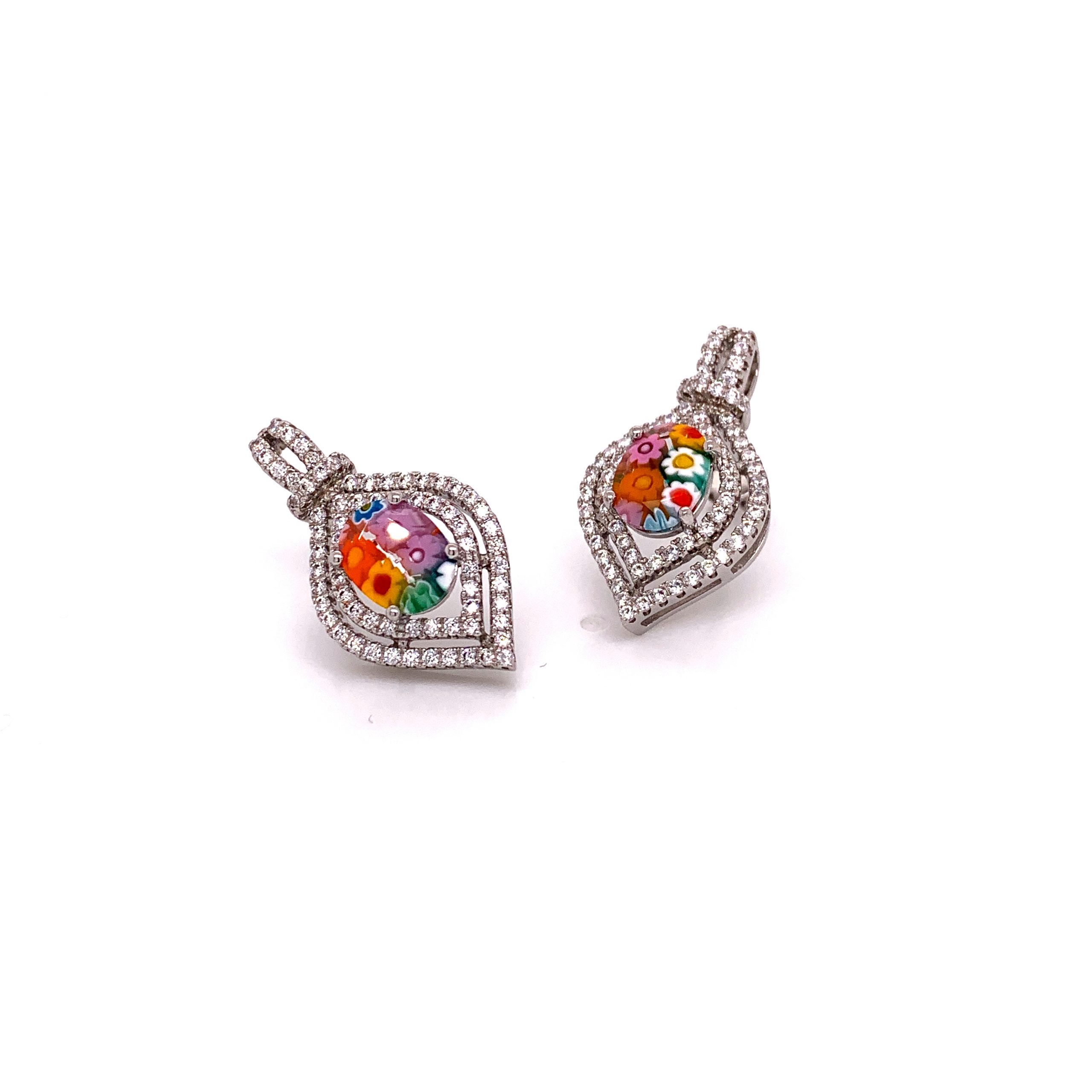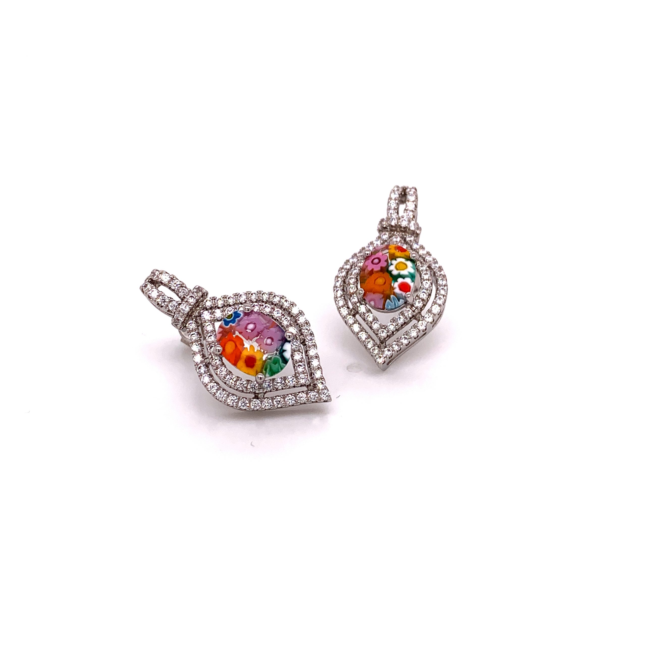 EarringsMillefiori Multicolor Double Halo MQ Shape CZ Oval Cut Murano Glass Earrings