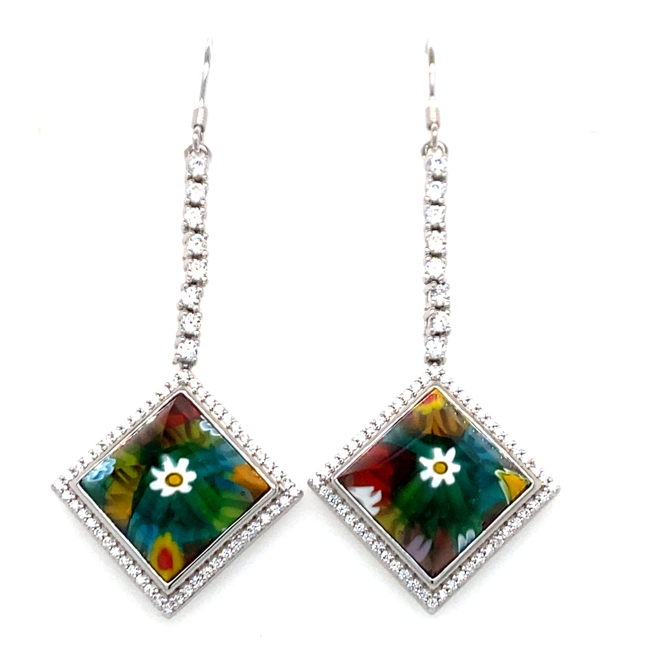 Murano Millefiori Princess Cut Glass And CZ Drop Earrings.