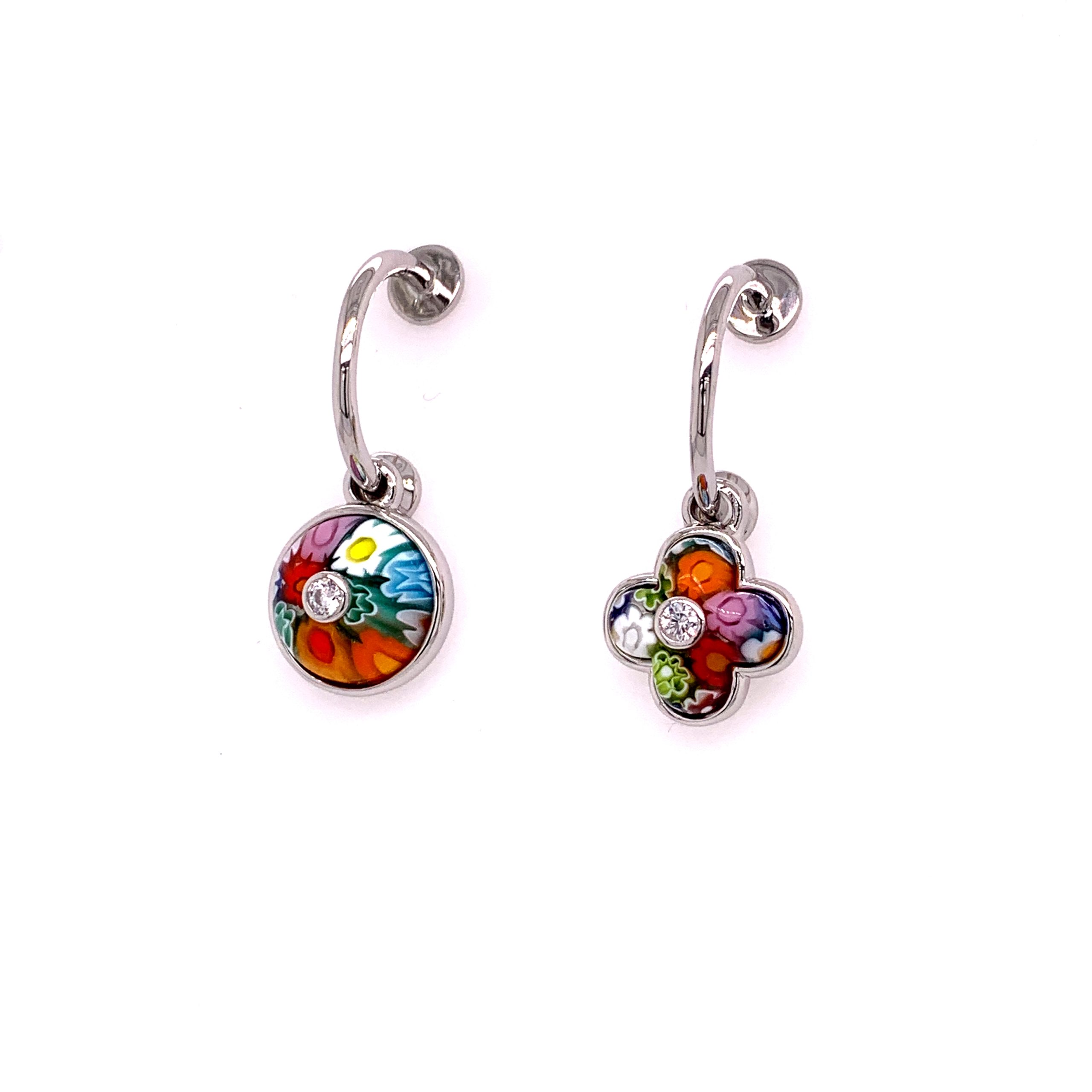 Hand Crafted, Sterling Silver 925 Mounts. Sterling Silver, Semi Hoop Earrings. Bezel Set, Round and Clover Cut, Murano Millefiori Multi Colored Glass. Bezel Set Cubic Zirconia Accents.