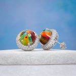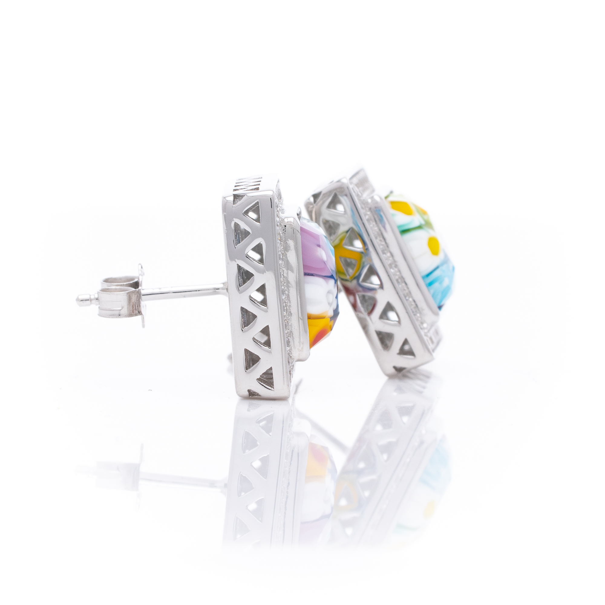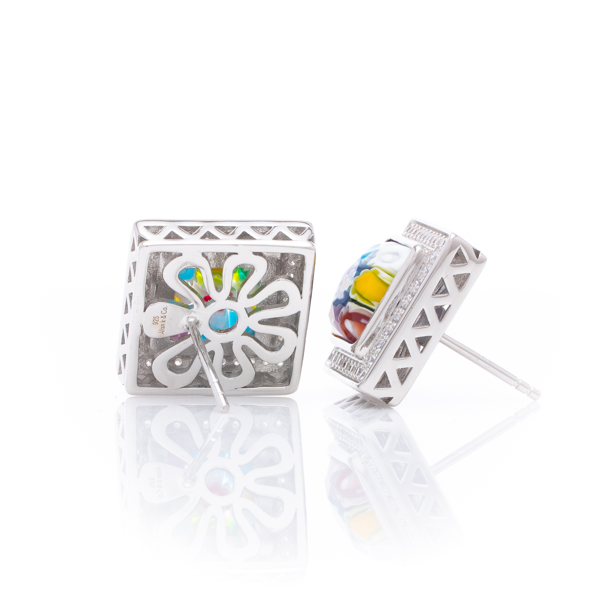 Murano Square Millefiori Glass & CZ Halo Button Earrings.