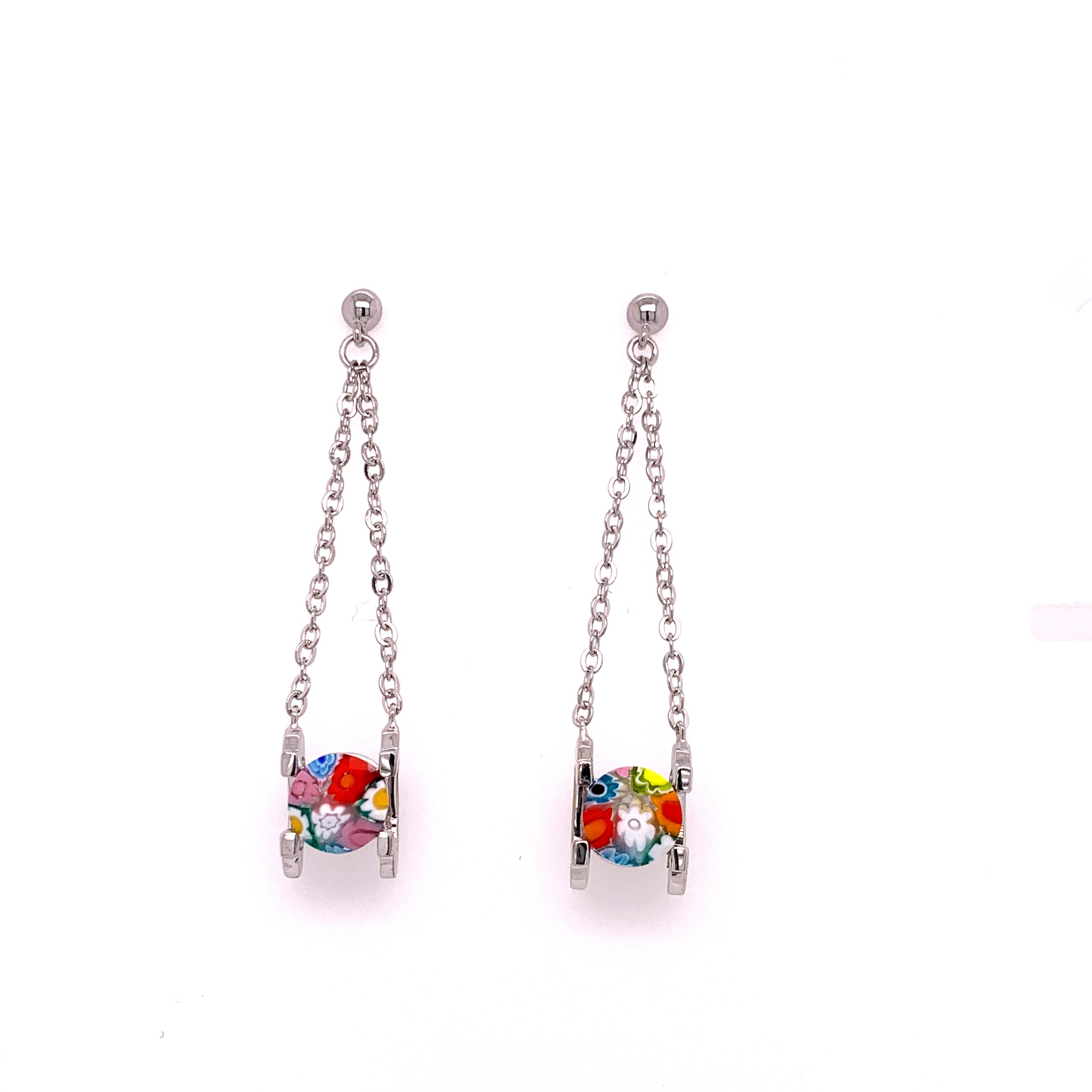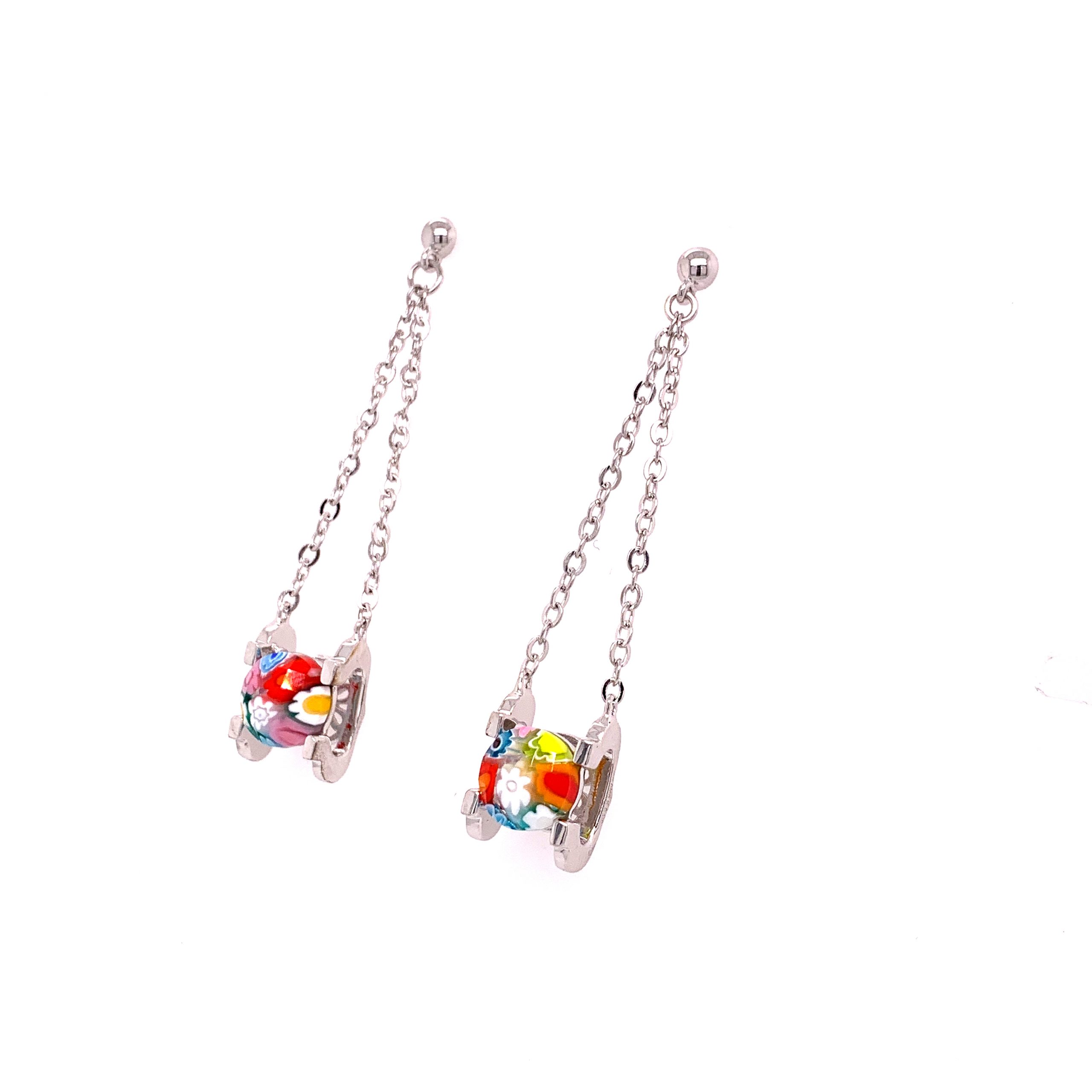 Murano Millefiori Multi Colored Round Glass Dual Chain Drop Earrings.