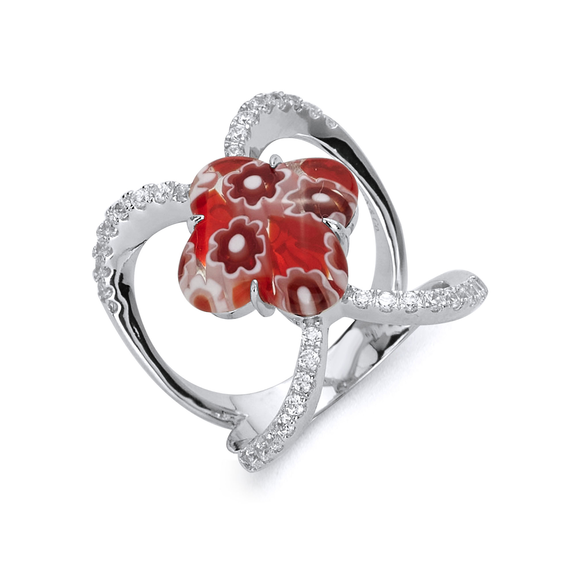 Hand-Crafted Sterling SIlver 925, Split Shank Mount. Micro Pave Set Cubic Zirconia Accents. Centering a Clover Cut, Red and Multi Colored, Millefiori, Murano Glass, Solitaire.