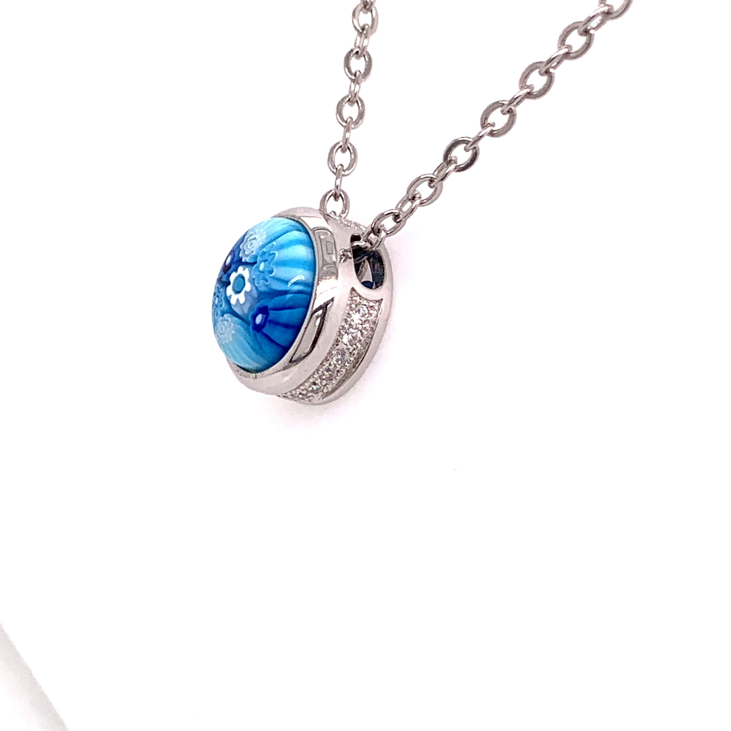 Hand Crafted, Sterling Silver Mount 925. Bezel Set, Round, Faceted, Multi Colored and Blue, Millefiori Murano Glass. Micro Pave Set Cubic Zirconia Accents.