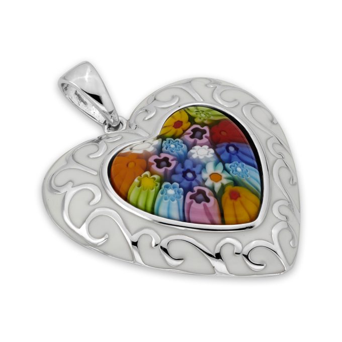 White Enamel Murano MIllefiori Multi-Colored Glass Heart Pendant.