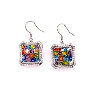 Murano Millefiori Cushion Cut Glass, Semi Halo Cubic Zirconia Drop Earrings.