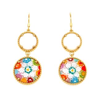 Millefiori Multi Colored Round Murano Glass and White Agate Gold Plated Sterling Silver Drop Ear Pendants.