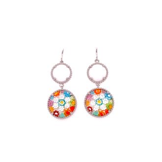 Millefiori Multi Colored Round Murano Glass and White Onyx, Sterling Silver Drop Ear Pendants.